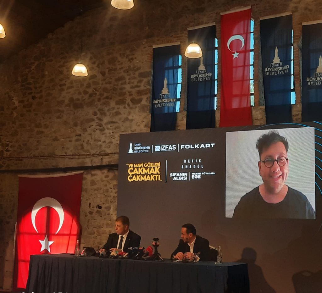 Refik Anadol’un sergisine yönelik de bilgi veren Tugay, “Verileri bir boya gibi işin algoritmasını bir fırça gibi yapay zeka teknolojisiyle kullanmak olağanüstü bir bakış açısı. Her zaman her yerde inanılmaz bir ilgiyle karşılanıyor. Ben bu iki eserin İzmir’de sergilenmesiyle birlikte İzmir’in sadece kültür sanata meraklı yurttaşları tarafından değil İzmir’in genç sanatçıları tarafından farklı bir ilham yaratacağını düşünüyorum. Burada fuar içerisinde fuarın başlangıcıyla beraber her iki sergiyi sizlerin beğenisine sunmak burada görevimizi yapmış olmak bizim için çok büyük bir onur ve keyif verici. İzmir için güzelliklere vesile olsun” ifadelerini kullandı. Canlı yayınla toplantıya bağlanan sanatçı Refik Anadol sergiler için çok heyecanlı olduğunu söyledi ve en iyi fikirlerimizi Türkiye’ye getirmeye önem gösteriyorum bu sergi bu yüzden çok kıymetli. İnsan ve makine arasında ilişkinin değiştiği bir döneme giriyoruz. İnsanların tamamen değiştiği bir dönemde bu sergiyi yapmak çok anlamlı. On yıl önce yapay zeka ile çalışmaya başladım. Dünya yeni yeni yapay zekanın ne olduğunu ve kullanıldığı zaman kıymetli bir şey olduğunu fark etmeye başladı. Serginin İzmir’de olması da çok güzel” ifadelerini kullandı.