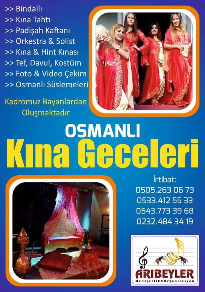 Arıbeyler Menajerlik ve Organizasyon Osmanlı kınalıkları denilen bindallı ve kaftanları tedarik ederek gecenin aslına uygun icra edilmesine imkan sağlıyor. Konser, düğün, sünnet, açılış, toplantı, seminer, konferans, Ramazan programı, semazen, stand-up, palyaço, mehter, halk ozanı, halk oyunları organize ediyor. Tasavvuf musikisi, Türk halk müziği, Türk sanat müziği, Fantezi&Arabesk, halk ozanı müzik kategorilerinde hizmet veren organizasyonun sanatçıları Mahmut Arı, Erol Arı, M.Hicabi Şahin, Cumhur Özer, Sertaç Ünal, Nilgün Saygı, Ömer Faruk Özcan, M. Emin Ayaz, Murat Anlar, Mustafa Aydın, Mithat Papağan gibi tanınmış isimlerden oluşuyor.