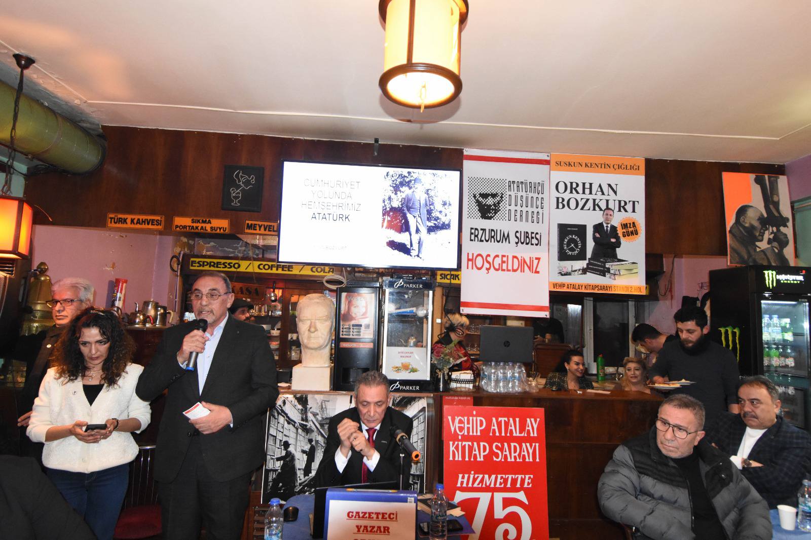 Gazeteci-Yazar Orhan Bozkurt’un “Suskun Kentin Çığlığı” adlı kitabı, Erzurum’da düzenlenen söyleşi programıyla tanıtıldı. Atatürkçü Düşünce Derneği (ADD) Erzurum Şubesi tarafından gerçekleştirilen etkinlikte Bozkurt, “Cumhuriyet Yolunda Hemşehrimiz Atatürk” başlıklı sunumuyla Milli Mücadele’nin kritik dönemeçlerini belgeler ve anılar ışığında anlattı. Program, yoğun katılım ve uzun süren alkışlarla tamamlandı.