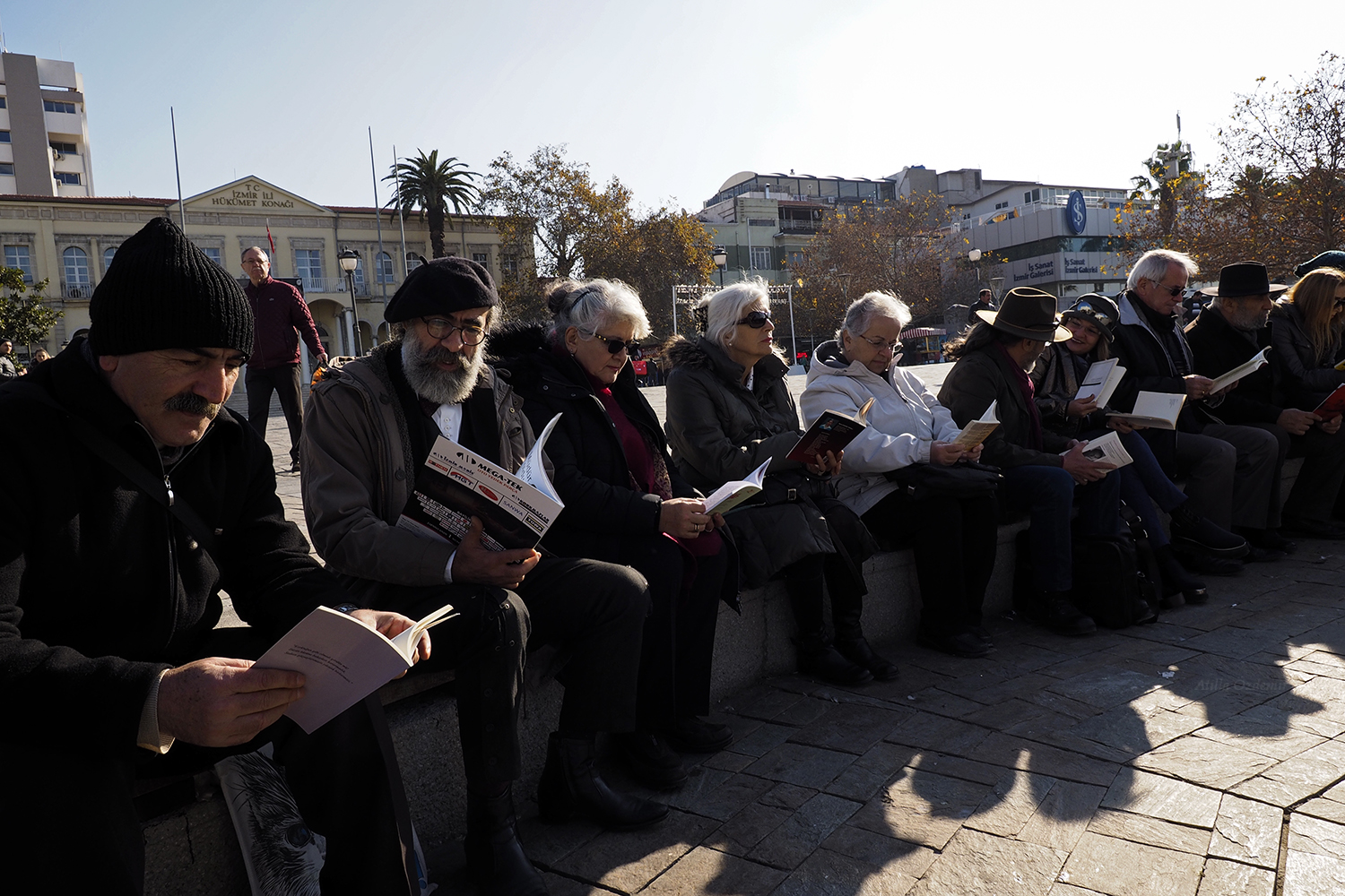 Kitap okuma etkinliğini yazın sıcağında, kışın soğuğunda üşenmeden, yılmadan her hafta gerçekleştiren İzmir Okuma Grubu’ndan Talat Aybilek, Ercan Doğu, Cahit Aşıkoğlu, Cem Seyhun Ünbay ve Harun Cici, öğrencilerin desteğinden memnuniyetlerini dile getirdi. Talat Aybilek, “Halkımıza ve yeni gençliğe kitap okuma alışkanlığı kazandırmamız gerekiyor. İzmir’in kalabalık semtlerinde insanlara kitap dağıtıp okumalarını istiyoruz ve bizler de onlarla birlikte kitap okuyoruz. Daha sonra da okunan kitapları başka insanlara verip onların da kitap okumalarını sağlıyoruz. Bu ülkenin gelişmiş beyinlere ihtiyacı var. Bunu da kitap okuyarak ve okutarak oluşturabiliriz. Bugün bizlere verdiğiniz destekten ötürü çok mutluyuz. Görüyoruz ki amacımıza ulaşıyoruz.” diye konuştu.