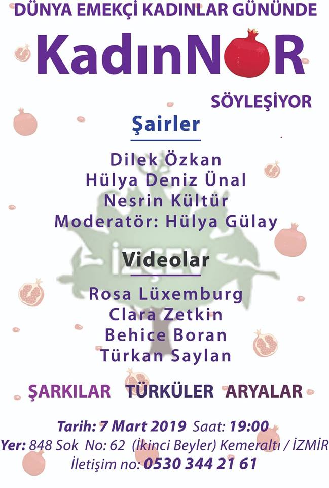 7 Mart akşamı İzmir Çevre Doğal Hayatı Koruma Derneğinin (İZÇEV) Konak 1. Beyler’deki tarihi binasında düzenlenen güzel bir etkinlik düzenlendi. 8 Mart Dünya EMEKÇİ KADIN NAR Günü nedeniyle dernek başkanı Besalet Kaya’nın kotardığı, Hülya Gülay’ın sunumunu yaptığı etkinlik Hasan Aslan’ın hazırladığı bir slâyt gösterisiyle başladı. Clara Zetkin, Losa Luxemburg, Türkan Saylan ve Behice Boran’ın hayatından kesitler izlendi.