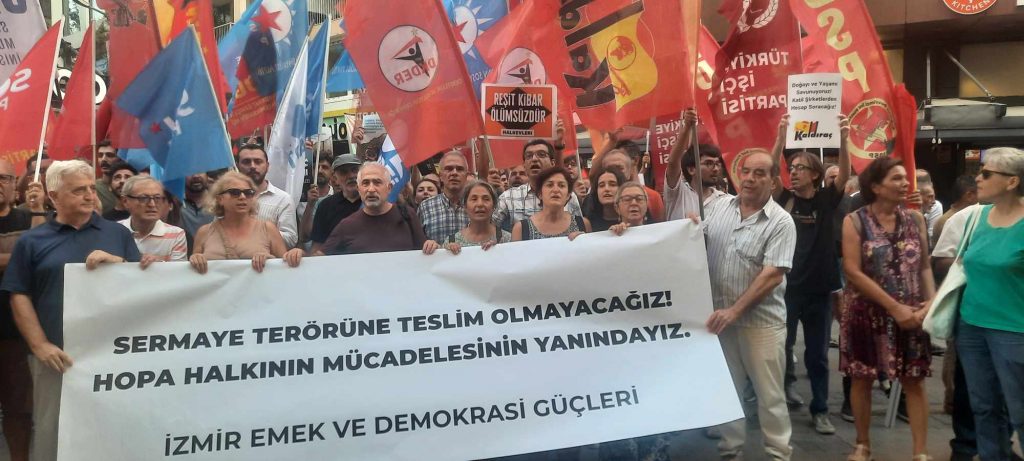 Ağaçların kesildiği bölge bir halkın ve diğer canlıların yaşam alanıdır. Katledilen canların sorumlusu sadece silahın tetiğini çekenler değil sistemin kendisidir. Silahlanmayı da parçası haline getiren sermaye terörü karşısında halk yine korunmasız kalmıştır. Söz konusu şirkette 2022 yılında bir iş cinayeti meydana geldiği ve bir işçinin bantların arasında kalarak yaşamını yitirdiği, aynı iş yerinin ruhsatsız çalıştığı için mühürlenmesine rağmen faaliyetlerini sürdürdüğünü biliyoruz. Dolayısıyla karşımızda hukuk, kanun, vicdan tanımayan, şimdi de ağaç kesmek, doğayı talan etmek için insan öldürmekten geri durmayan bir şirket olduğu gerçeği ile karşı karşıyayız. Akbelen köylüleri nasıl yaşam alanları için, ormanlar için direndilerse aynı direniş yine aynı nedenlerle ve aynı meşruiyetle Hopa’da yaşanmaktadır. Halkın yaşam alanına, doğaya, çevreye düşman bir şirketin turistik tesis yapmak için ağaçları ve insanları katledecek kadar gözünün dönmüş olması karşısında tüm kesimlerin tepki göstermesi ve dayanışması çok önemlidir. İzmir Emek ve Demokrasi Güçleri olarak hiçbir canlının rant için katledilmesine izin vermeyecek, tetiği çeken ve çektirenler ile saldırıya sebep olan herkesin cezalandırılması için sürecin takipçisi olacağız. Sermayeden değil doğadan, terörden değil yaşamdan yana mücadelemizi sürdüreceğiz.