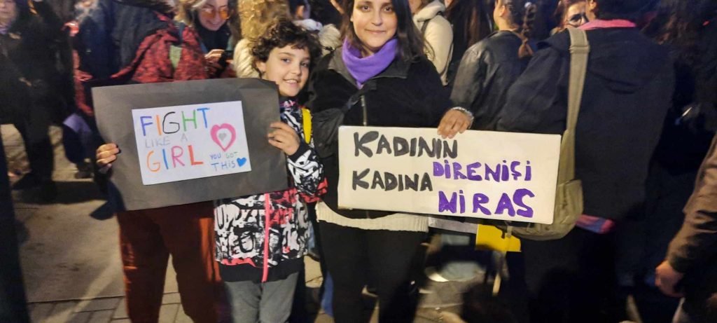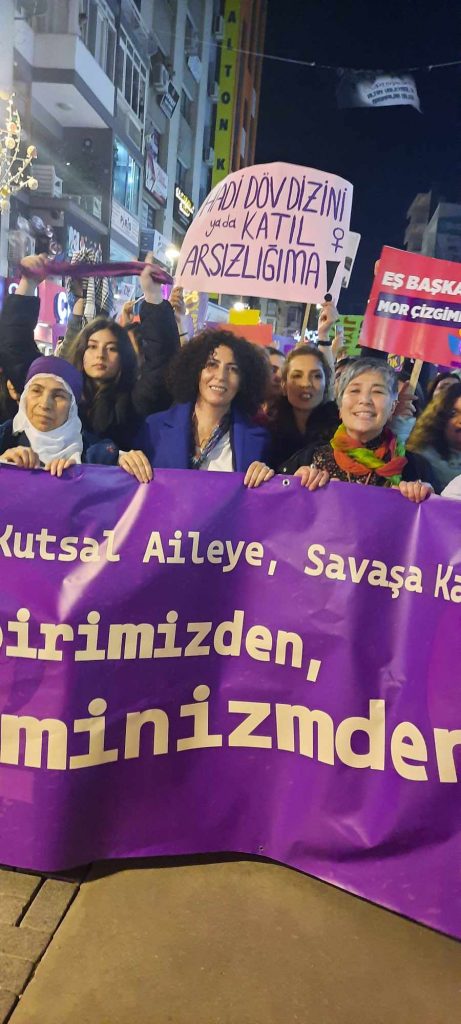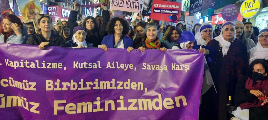 “Dünyanın birçok yerinde sağ-muhafazakarlığın yükselişiyle kadınlara ve LGBTİQ ’lara yönelik şiddet ve nefret politikaları her geçen gün artmaya devam ediyor. Toplumsal cinsiyet karşıtlığı üzerinden şekillenen bu hareketler bir yandan doğrudan varoluşlarımızı hedef alırken, bir yandan da kadınları kutsal aile içerisine hapsediyor. Türkiye’de de bu sağ popülist söylemleri üreten AKP-MHP iktidarı ve yancıları Yeniden Refah Partisi, her geçen gün kadınları ve ve lubunyaları hedef alan açıklamalarla karşımızda. Kadınları ev içi ücretsiz emek, kutsal aile ve annelik üzerinden evlere hapsetmeye çalışan AKP-MHP ittifakı, İstanbul Sözleşmesinin de feshedilmesinin ardından 6284 Sayılı Kanuna saldırılarını sürdürüyor. Dişimizle tırnağımızla kazandığımız haklarımızı ataerkiye teslim etmeye niyetimiz yok. Medeni Kanuna yönelik düzenlemelerle makbul aile ve makbul kadınlık anlayışını anayasal düzlemde kalıcılaştırmak isteyen iktidar, nafaka hakkımızdan soyadı kanununa kadar kazanılmış haklarımızı gasp ediyor. Dincileştirilen eğitim, gerici açıklamalar ve hilafet çağrılarıyla birlikte laikliğe, yaşamlarımıza yöneltilen tehditleri görüyoruz ve kabul etmiyoruz. AKP’nin inşa ettiği emek rejiminde hayatlarımız da emeğimiz de gün geçtikçe ucuzluyor. Yoksullukla birlikte kadınlar ve LGBTİQ ’lar evlere de şiddete de daha çok hapsoluyor.”