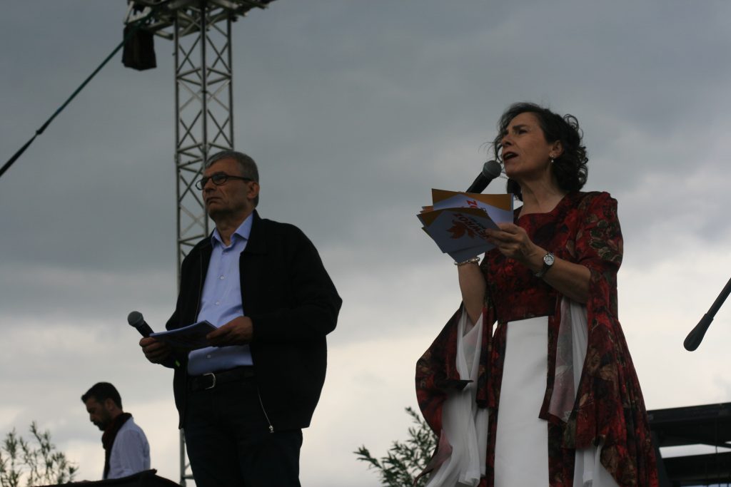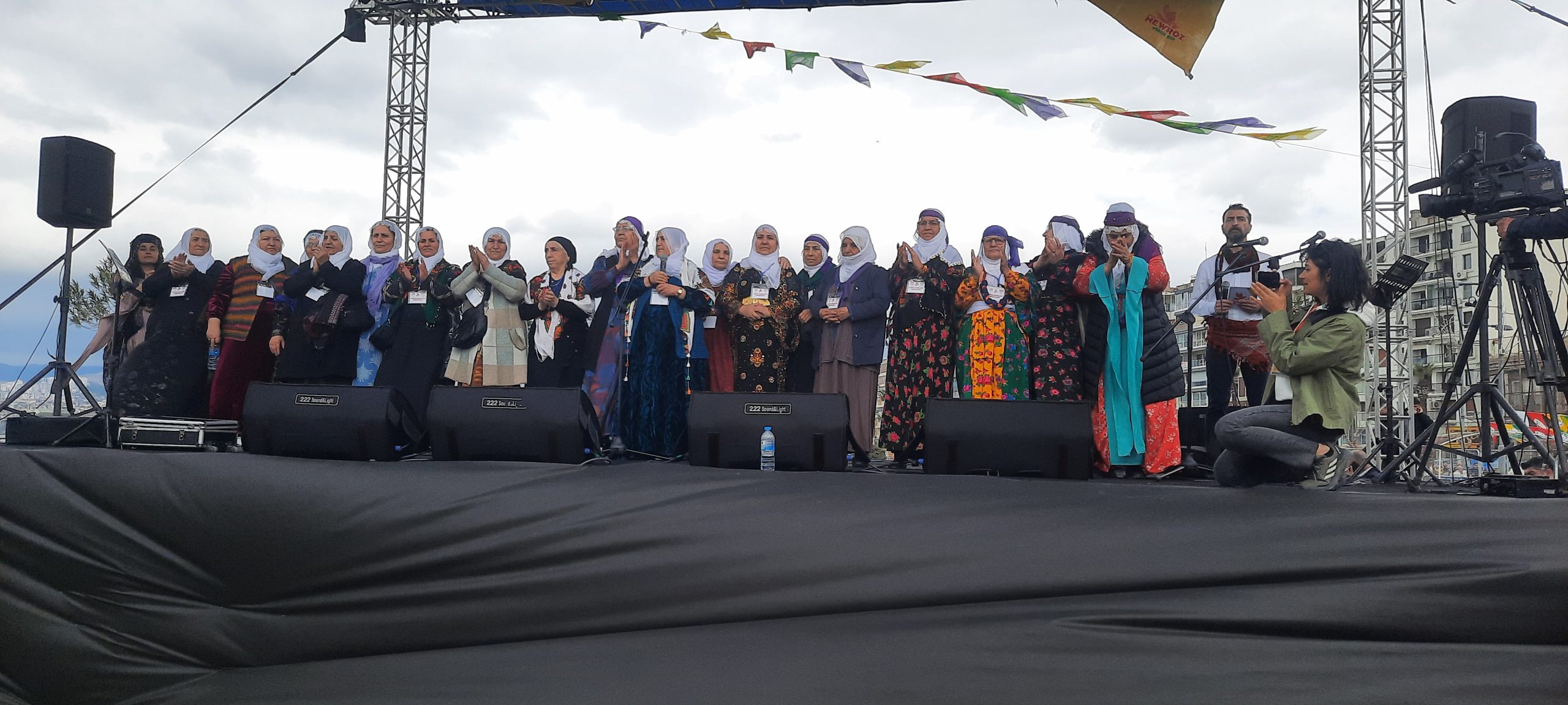 Newroz programı, saygı duruşu ile başlarken İzmir Tertip Komitesi’nin kitleyi selamlaması ardından DEM Parti İzmir İl Eş Başkanları Fulya Erdoğan ve Selçuk Odabaşı yaptığı konuşmalarla halkların Newrozunu kutladı. Ardından Barış Anneleri sahneye davet edilirken, Newroz ateşini Barış Anneleri ile birlikte Keskin Bayındır, Ali Kenanoğlu ve Meliha Kayacı yaktı.