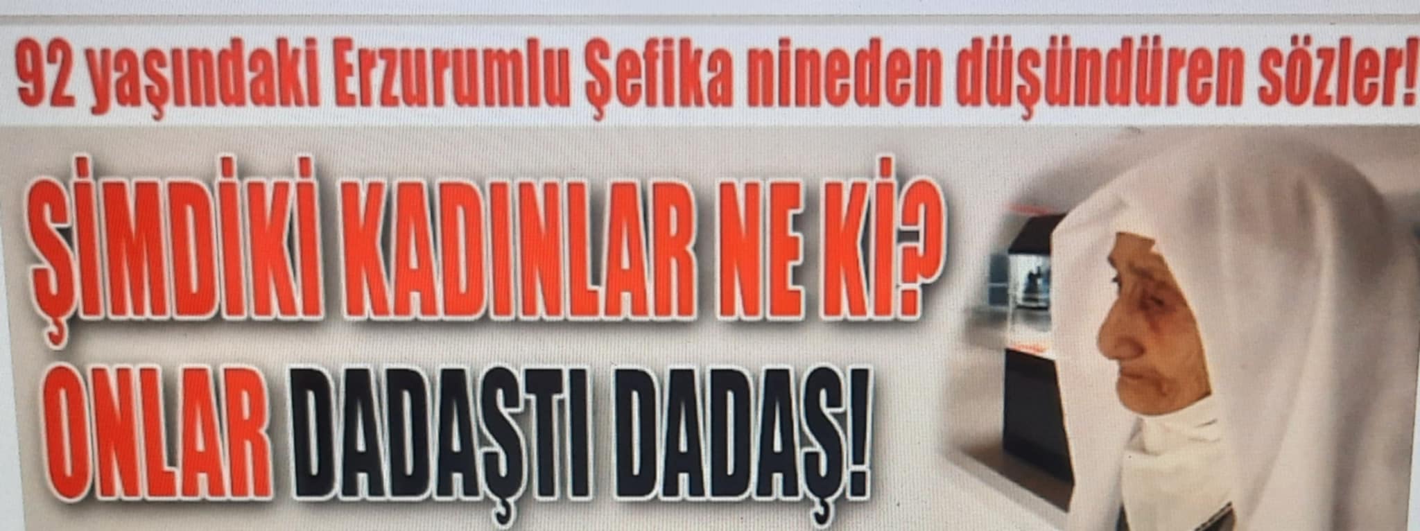Erzurum’da yaşayan 92 yaşındaki Şefika Taş, sözleriyle sosyal medyada kısa sürede büyük ilgi gördü. Tortum’un Alapınar Mahallesinden yola çıkan ve Erzurum Kültür Yolu Festivali’ne katılan Şefika Nine, Milli Mücadele kahramanı kadınlar sergisine katıldı. Burada yaptığı konuşmalarıyla dikkatleri üzerine çeken 92 yaşındaki Şefika Taş, ” Şimdiki kadınlar ne ki üflesen düşer, bunlar Dadaş, herifnen herif olmuşlar, mermi taşımışlar harbe yürümüüşler Erzurum kadınları güçlü kadınlar.” dedi.
