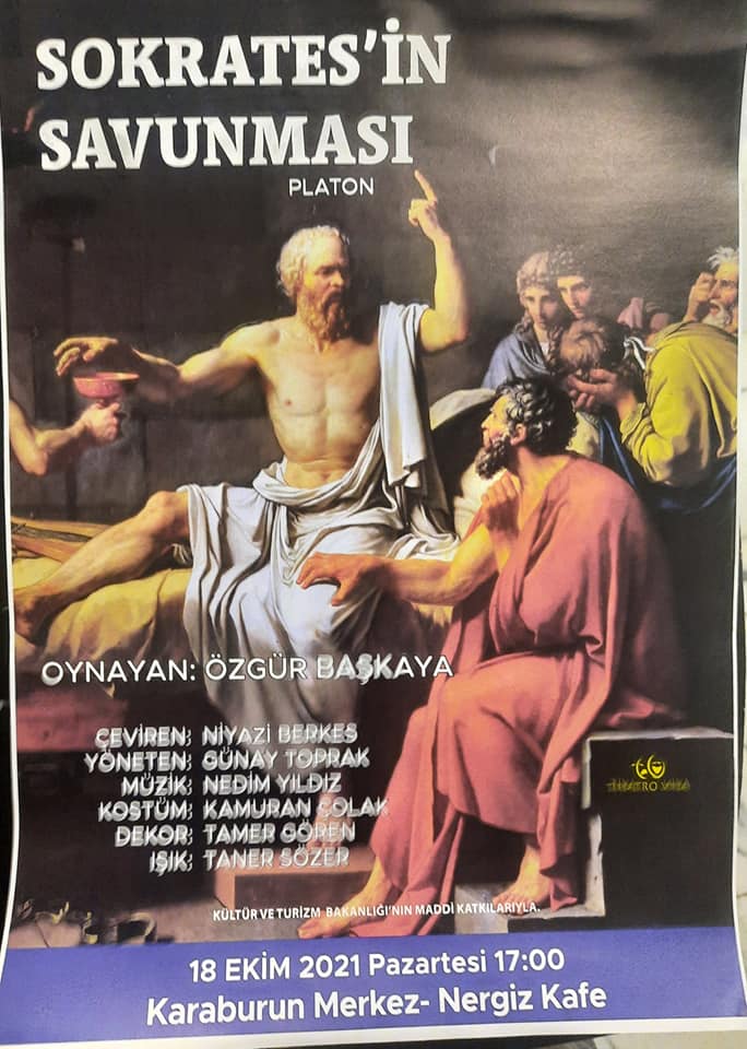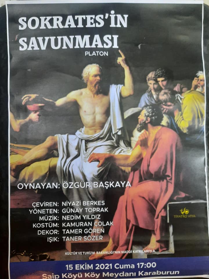 Karaburun Belediye Başkanı İlkay Girgin Erdoğan’ın katkıları ile 15 ekim2021 cuma saat 17 de Karaburun saip köy meydanında 18ekim 2021 pazartesi Karaburun merkez Nergiz kafede oynanacaktır tüm gelen seyircilerimize iyi seyirler ETKİNLİK BİLGİLERİ Oyun, Sokrates’in ünlü savunmasını ve mahkum edilme süreçlerini anlatmaktadır. Kendisine yöneltilen “gençlerin ahlakını bozmak ve dinsizlik” suçlamalarına karşı Atina vatandaşlarından oluşan yargıçlara, suçlamaların yalan ve asılsız olduğunu, sorular sorarak kanıtlamaya çalışır. Bu savunma; ‘demokrasi’, ‘adalet’ ve ‘bilgi gibi kavramların tartışıldığı tüm insanlığa yönelik büyük bir ders olmuştur. Güncelliğini de her dönem korumaktadır.