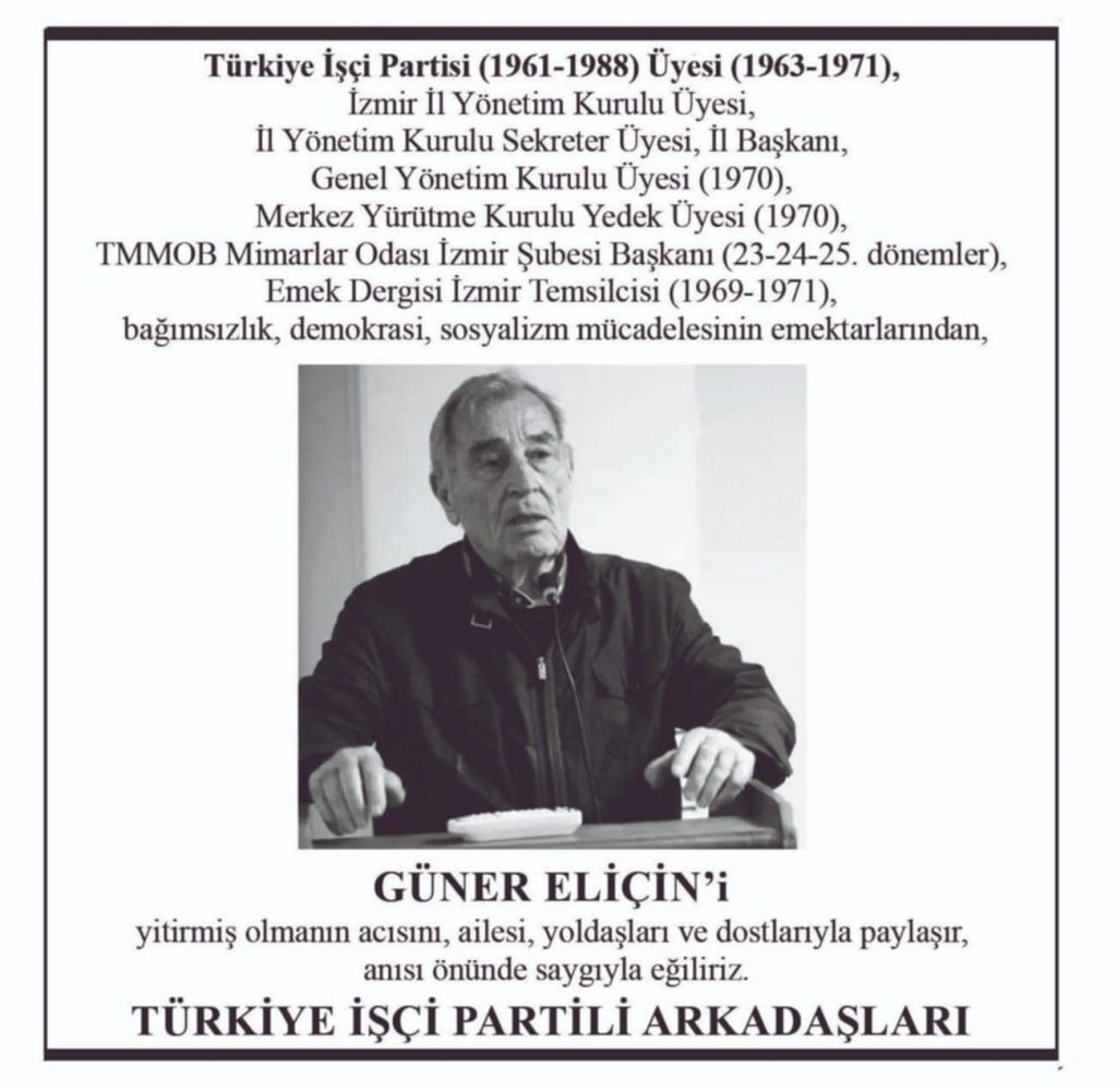 Yüksek Mimar Güner Eliçin’in cenazesine Konak’ın eski belediye başkanlarından Muzaffer Tunçağ, TİP TMMOB üyeleri, TİP İl Başkanı, ESHOT eski genel müdürü Fügen Selvitopu, avukatlar ve çok sayıda seveni katıldı. Konak eski Belediye Başkanı Muzaffer Tunçağ, “Sevdiğimiz, duayen bir değerlimizdi. Kaybı hepimizi çok üzdü” dedi.