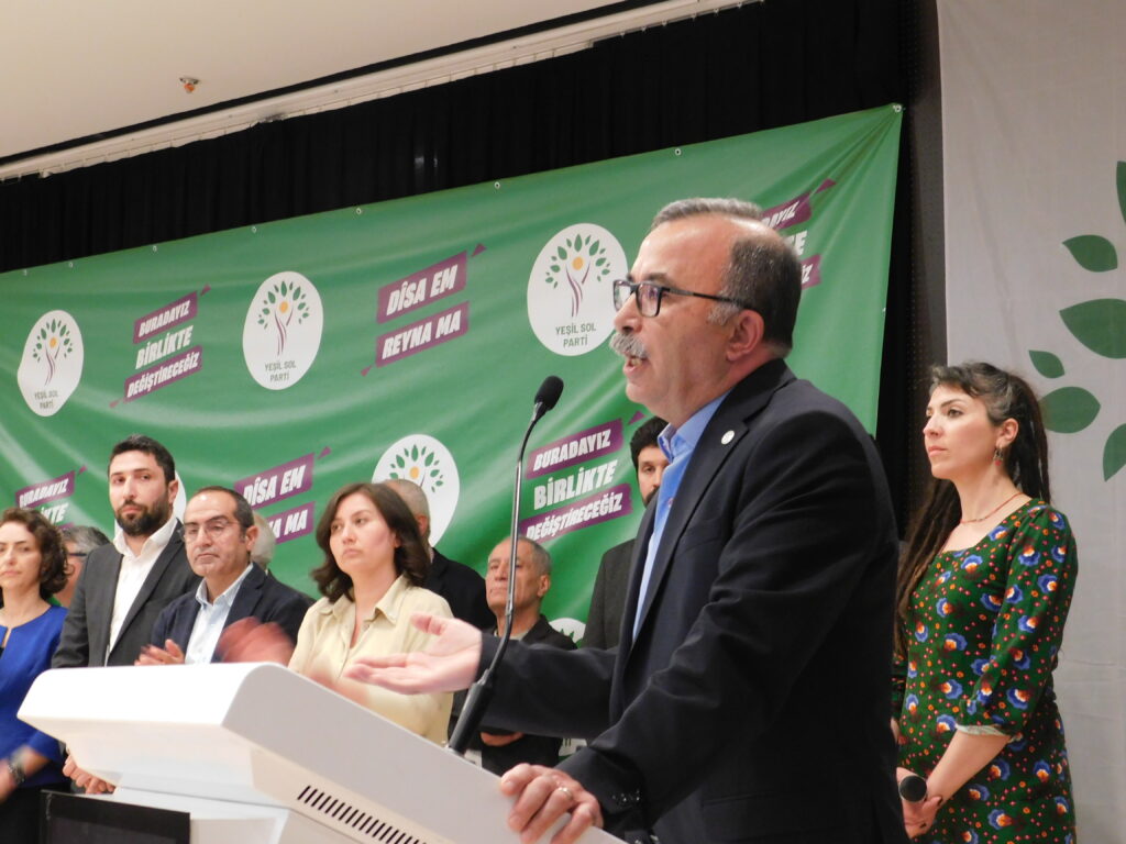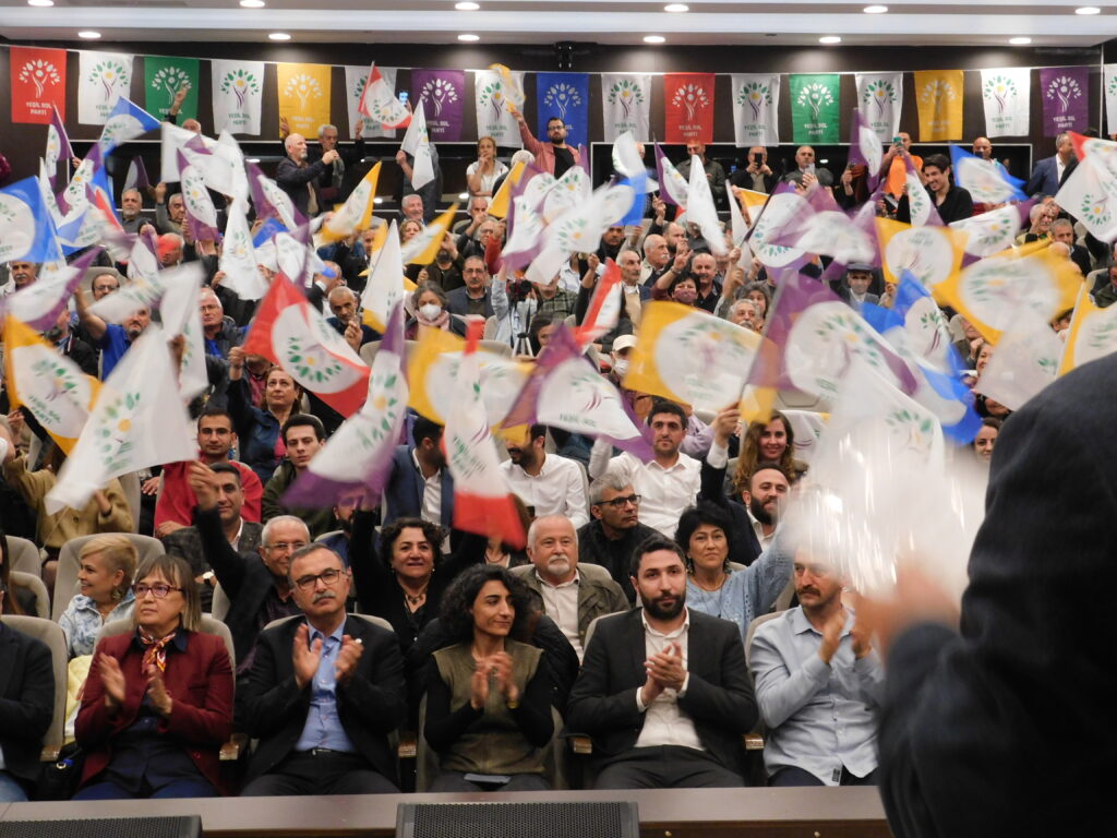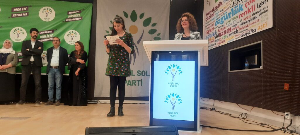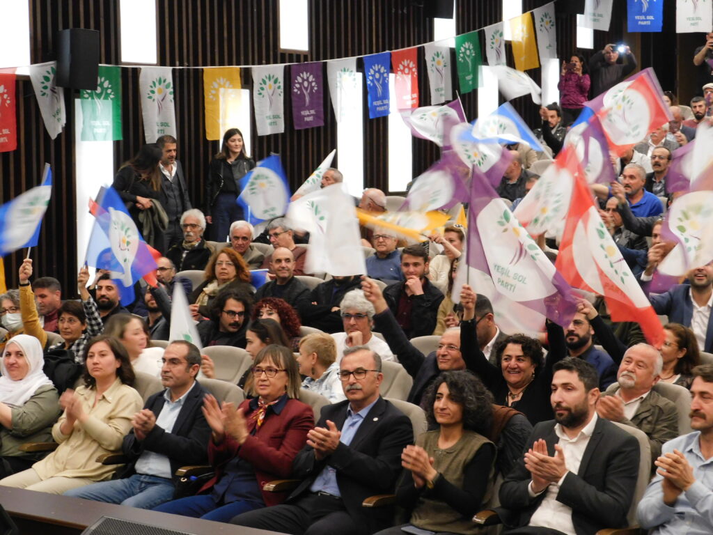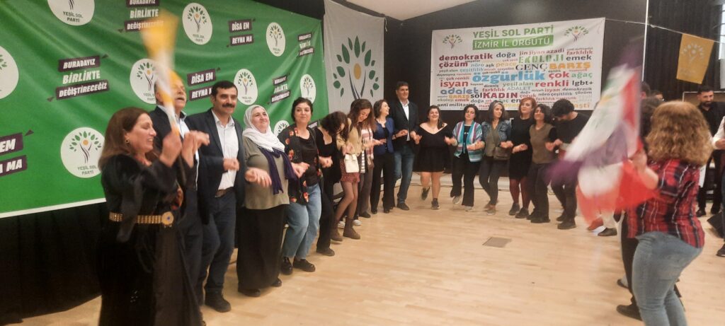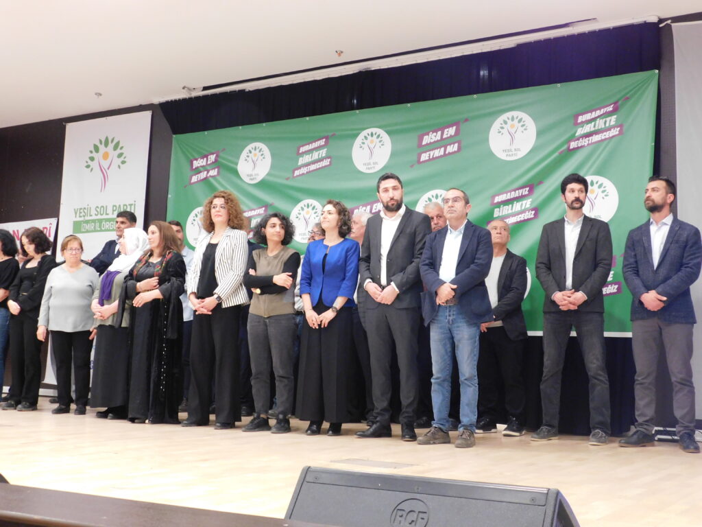 Yeşiller ve Gelecek Sol Parti (Yeşil Sol Parti), İzmir milletvekili adayları halkla buluştu. Karabağlar’da bulunan Necati Kültür Merkezi’nde düzenlenen etkinlikte salona “Savaşa hayır”, “Üreten biziz yöneten de biz olacağız”, “Barış içinde eşit, özgür, yeşil bir dünya için” yazılı pankartlar asıldı. Etkinliğe, Özgürlük İçin Hukukçular Derneği (ÖHD), İnsan Hakları Derneği (İHD), Anadolu Yakınlarını Kaybeden Ailelerle Yardımlaşma ve Dayanışma Derneği (ANYAKAY-DER), Din Alimleri Yardımlaşma ve Dayanışma Derneği (DİAY-DER), (EGE TUHAY-DER) İzmir Şubeleri, Özgür Kadın Hareketi (TJA) Barış Anneleri İnisiyatifi, TÖP, SYKP, EMEP, Tüm Emekliler Sendikası ile HDP il ve ilçe örgütleri katıldı
